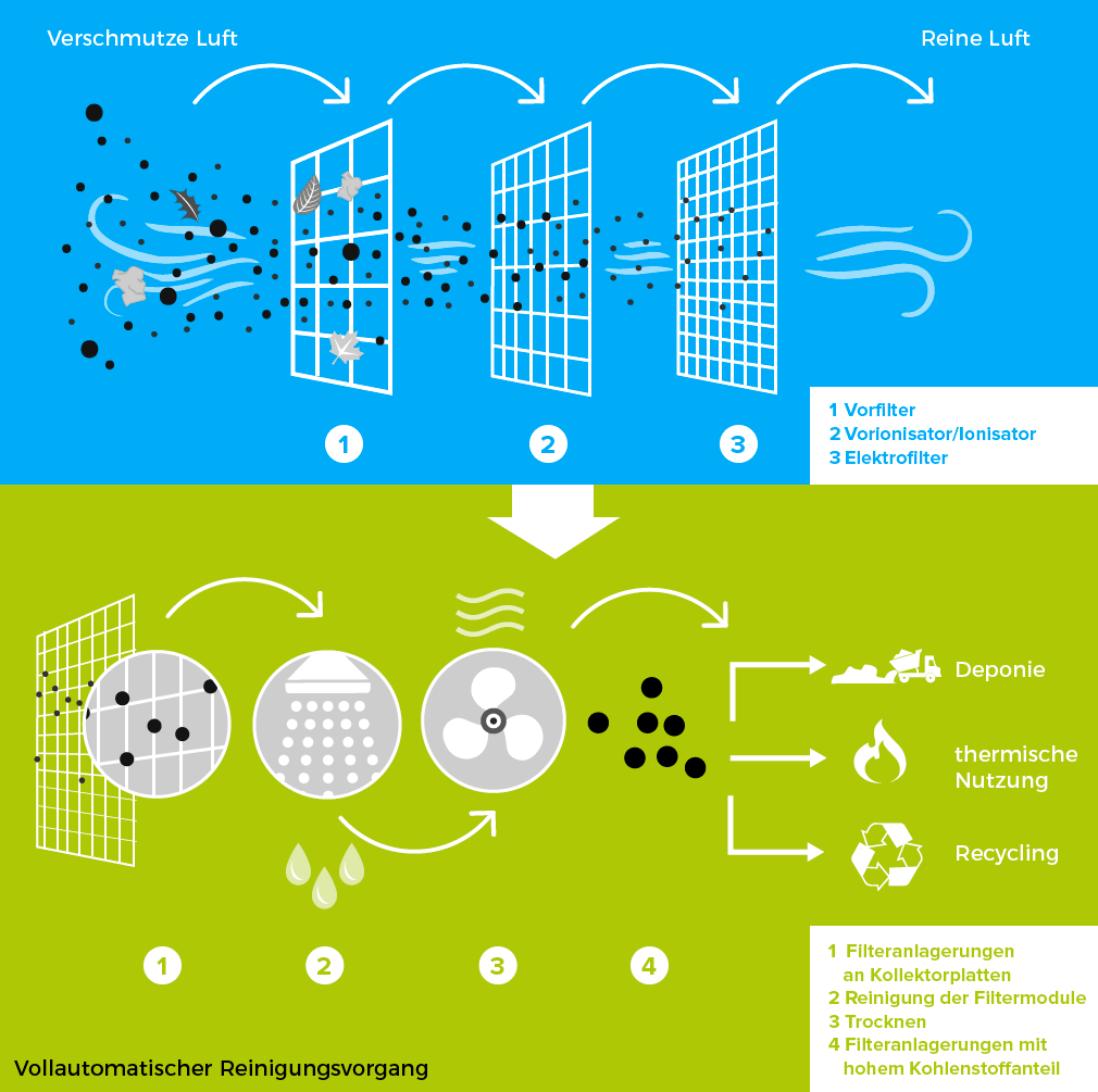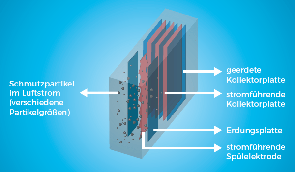 Anschließend durchströmt die Luft einen zweistufigen Elektrofilter, bestehend aus einem Ionisator und einem Kollektor. Im Ionisator werden die im Luftstrom enthaltenen Feinstaub- und Rußpartikel elektrisch aufgeladen. Diese lagern sich anschließend am Kollektor an, wo sie effektiv abgeschieden werden. Der Elektrofilter entfernt mehr als 85 % der schädlichen Partikel, einschließlich der besonders lungen- und gesundheitsschädlichen PM1-Partikel.