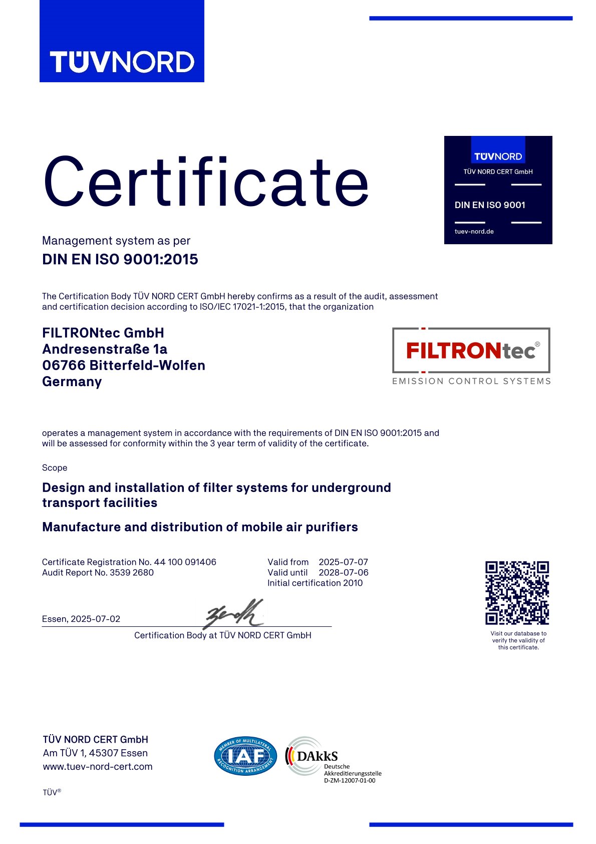 FILTRONtec has been certified by TÜV since 2008 according to DIN ISO 9001.